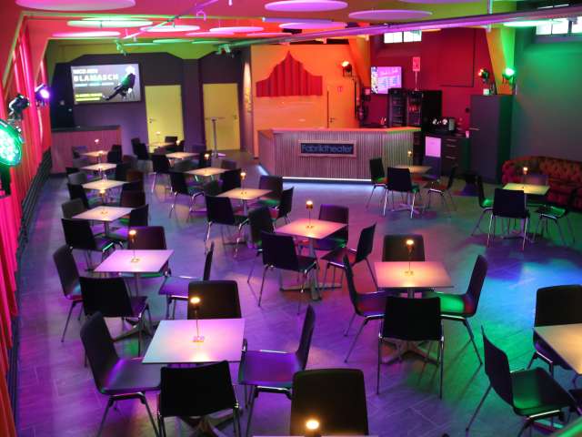 Der Theatersaal bietet 117 Sitzplätze, das gemütliche Bistro rund 60 – ideal für einen unterhaltsamen Abend oder auch für Workshops, Privatfeiern und Firmenevents.